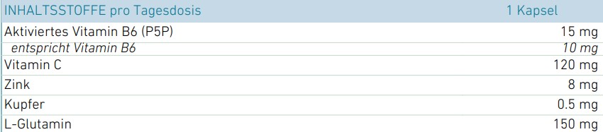 L-Glutamin, Calcium-L-ascorbat, Hydroxypropylmethylcellulose (Kapselhülle), Füllstoff: Cellulosepulver, Zinkcitrat, Pyridoxal-5'-phosphat, Kupfercitrat.
