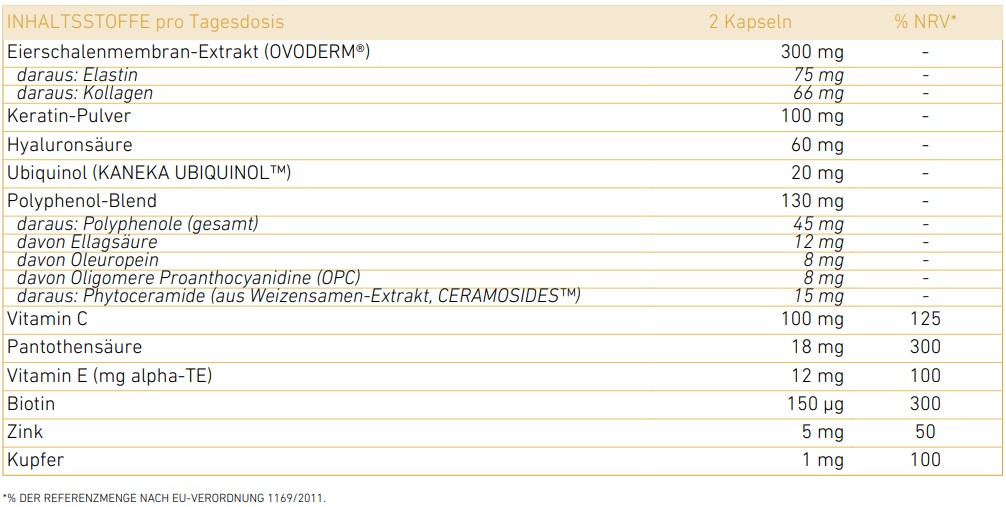 (enthält Soja), Hyaluronsäure, D-alpha-Tocopherylacetat, Zinkpicolinat, Calcium-D-pantothenat, Füllstoff: